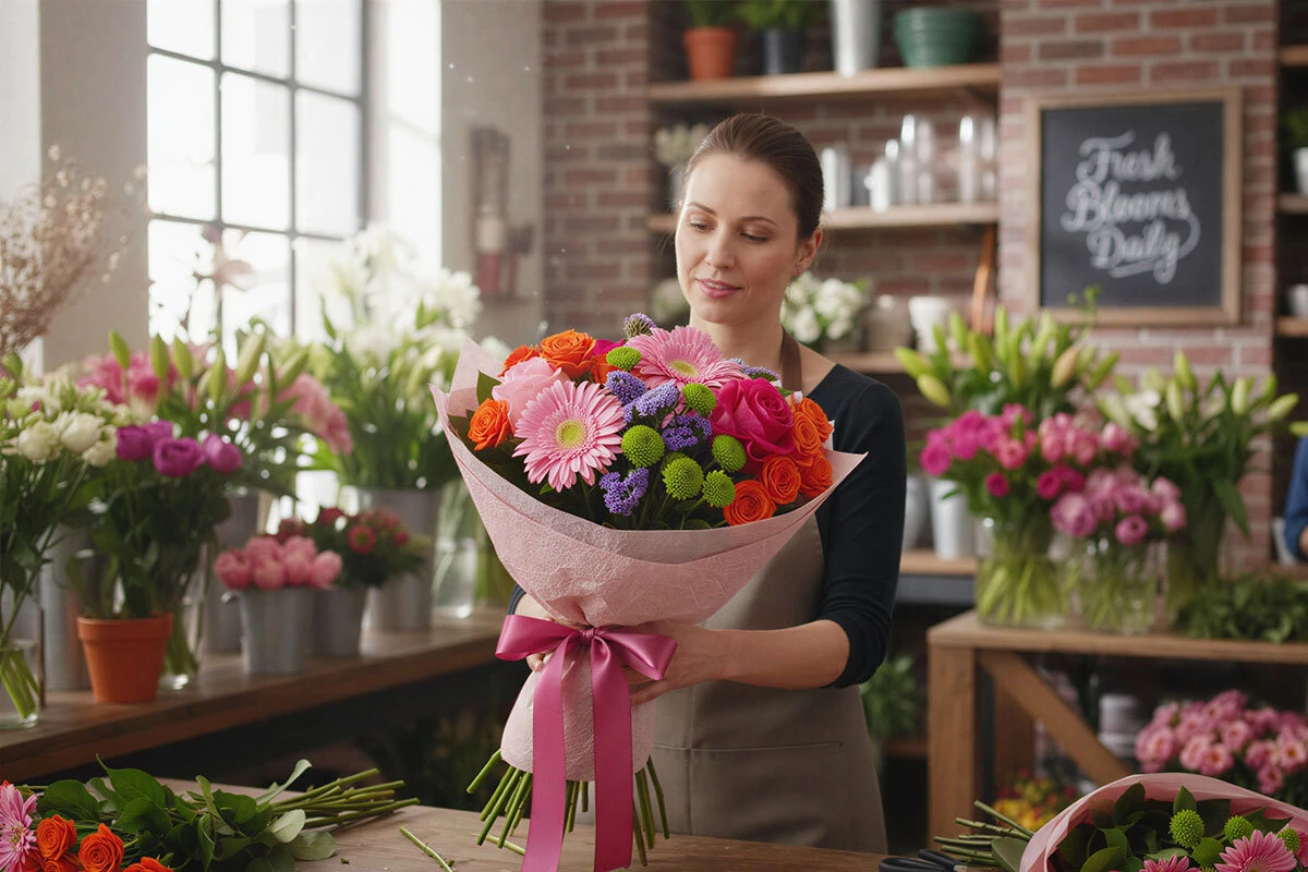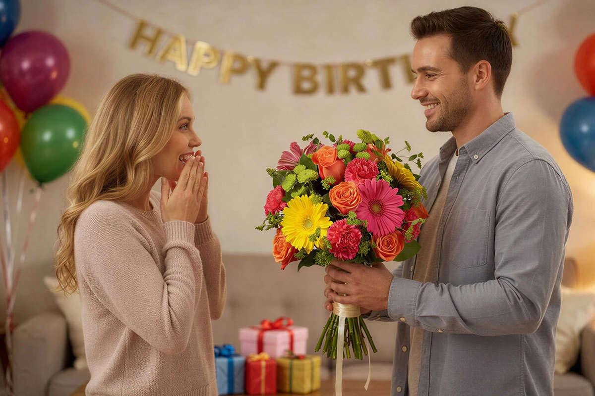 Popular birthday flowers include bright mixed bouquets, colorful roses, sunflowers, lilies, gerbera daisies, and seasonal florist-designed arrangements.